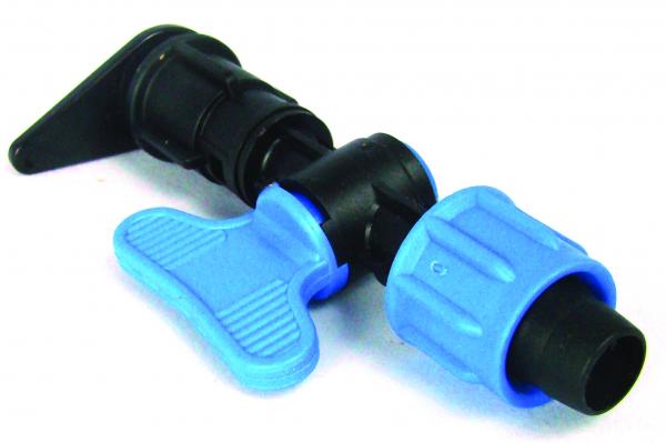Black body with blue handle . Use to turn drip lines on or off .