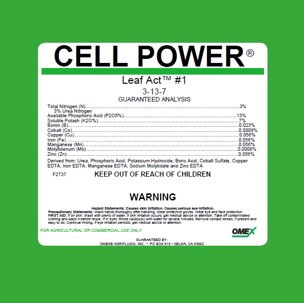 A complete high Phosphorus liquid blend fertilizer 3-13-7 with essential micronutrients and Omex’s proprietary EBA technology . Apply early in the season following transplanting or seeding for strong early root development and increased photosynthesis . LEAF ACT #1 can be applied foliar or through drip irrigation at 1-4 quarts per acre. LEAF ACT #1 may also be applied any time throughout the season when crops are showing signs of phosphorus deficiencies . See label for full recommendations and compatibility .