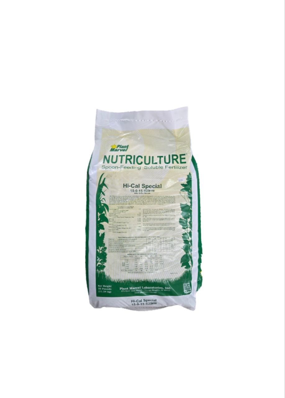 Hi-Cal special 15-0-15 is a plug growing formula with high nitrate nitrogen, calcium, magnesium and minor elements, all combined into a totally soluble mix . The trace elements are delicately balanced at levels that have proven to work well . This formula will work when phosphate is not a problem or being supplied separately.